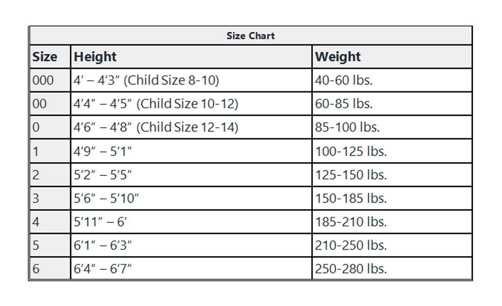 | 000 | 4′ – 4’3″ (Child Size 8-10) | 40-60 lbs. |