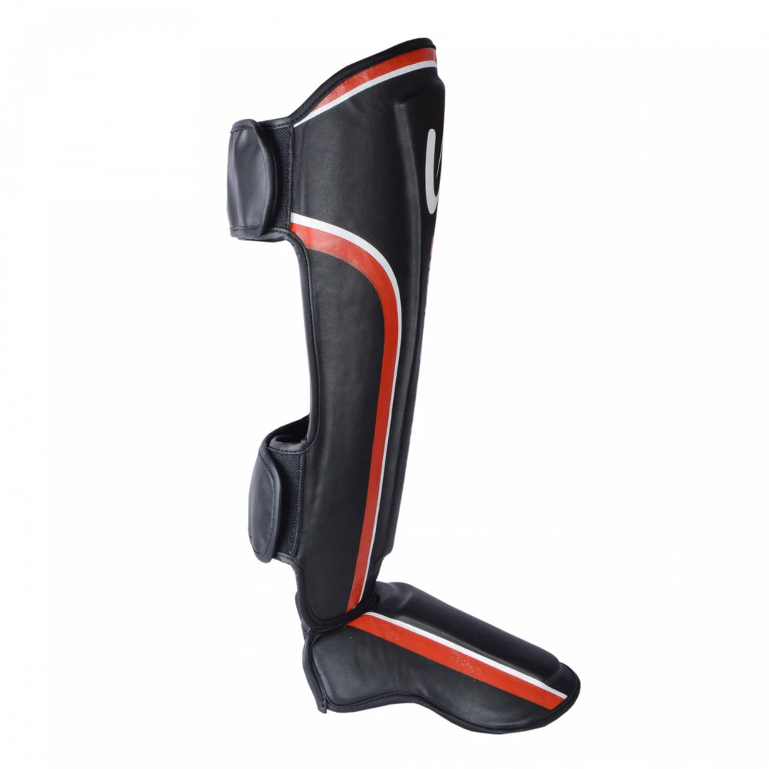 Shin pads are massively important for MMA and Muay Thai training. Take your MMA session to the next level with our elite blackout shin instep which is individually hand-crafted using premium quality faux leather and impact foam for heavy training whilst being a stunning addition to your gym. These are designed for maximum striking protection while you’re training or grappling. The body of the guards contours to your leg to hold them tight on your shins and insteps. The above-calf velcro loop closure and foot loop help you position the guards correctly on your legs and keep them secure.