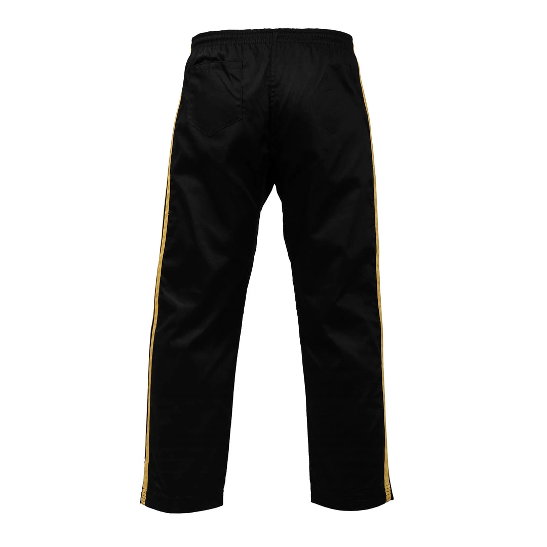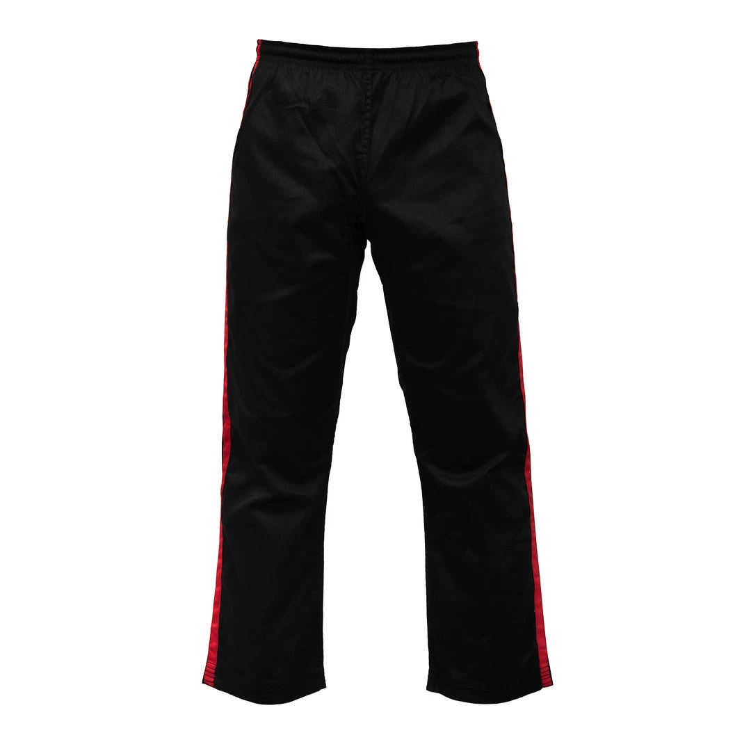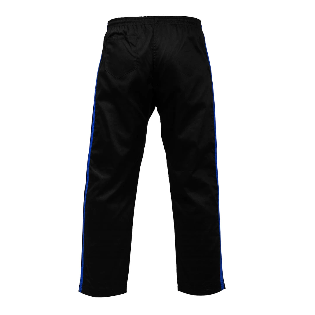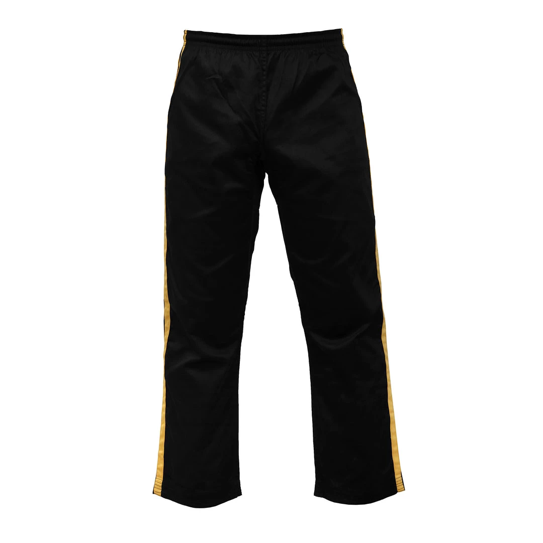 The PFG striped karate pants are made of high-quality cotton & polyester blended fabric to ensure lightness and durability. The material allows total freedom of movement and due to their reinforced seams, the pants will have a long lifespan to accompany you in your training and fights. The wide stretch belt guarantees an excellent fit for the athlete. The pants efficiently attach to the waist thanks to a drawstring design and will keep up with your footwork without running the risk of slipping or riding up. On the aesthetic level, their appearance adapts to every style of fighter and will be suitable for all levels, beginners to professionals.